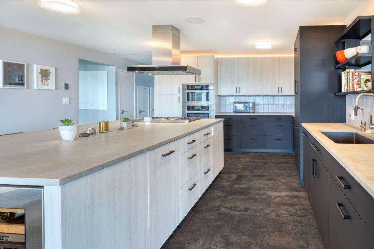 To start, we removed both sides of internal walls and reconfigured plumbing and structural support. We then created a design that maximized the views and integrated industrial and mid-century styles, featuring steel shelving and quartz countertops that resembled concrete.