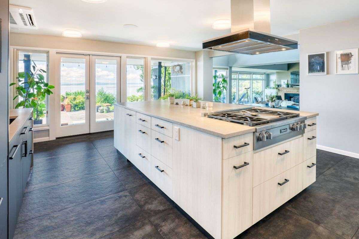 The top priorities for the client’s kitchen were a space for entertaining and to enjoy the sweeping Sound views. The existing late-90s kitchen was outdated and the walls separated the kitchen from the rest of the home.