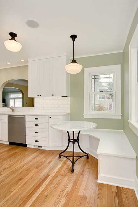 The kitchen in this 1926 Tudor was on the smaller side – the clients came to us with the challenge to increase its overall size, create additional space for cabinets, countertops, and appliances, while retaining the traditional style and period details of the home. Schulte Design Build’s unique solution to creating this desired additional space was to utilize an existing arched doorway between the kitchen and dining room. Rather than completely fill in the doorway, Schulte installed a sink in the center of the former archway, leaving the top open to create a peekaboo space to interact with dining guests while preparing meals. We also installed custom bench seating in the area that was formerly an enclosed porch – essentially building a small extension off the side of the house. To mimic the period details of the house, a new, custom leaded glass window was installed, perfectly matching the existing, original windows. White shaker cabinets were selected for a traditional, yet fresh and modern look.