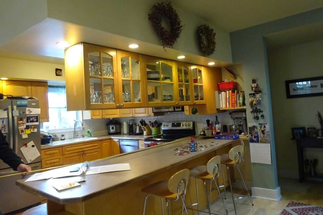 This house has an interesting past. Originally a neighborhood corner store, it was later converted to a residential home. Prior to its purchase by the current owners, it had been remodeled and expanded many times over the years. Unfortunately, some of the previous upgrades were not done very well and our clients needed to fix it which is what prompted this project. Design-wise, the kitchen was cut off from the rest of the open floor plan with a peninsula with upper cabinets which made it closed in and cramped. The finishes were outdated and did not fit the client’s aesthetic. The new kitchen design opened the space and connected it to the rest of the house by replacing the peninsula and cabinets above with an island that improved traffic flow. We eliminated a dropped ceiling and soffits which created a seamless ceiling height throughout the main floor. We moved appliance locations to maximize the cabinets and countertops and make using them easier. We also rebuilt the floor structure at the kitchen/dining area to fix the poor construction from the past. All the flooring on the main floor was replaced as well which ties everything together. Once the project was complete the client commented that we captured her personality perfectly. “Every time I look at the space, I think, this is me”.