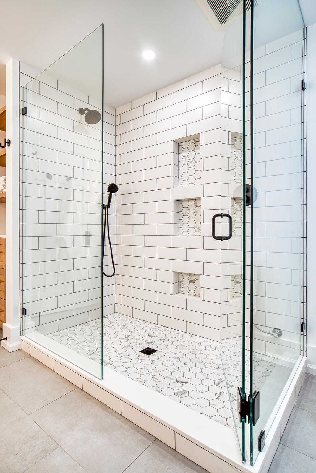 In this Shoreline bathroom remodel, crisp white walls set the stage for a fun and textured earth-toned floor, blending...
