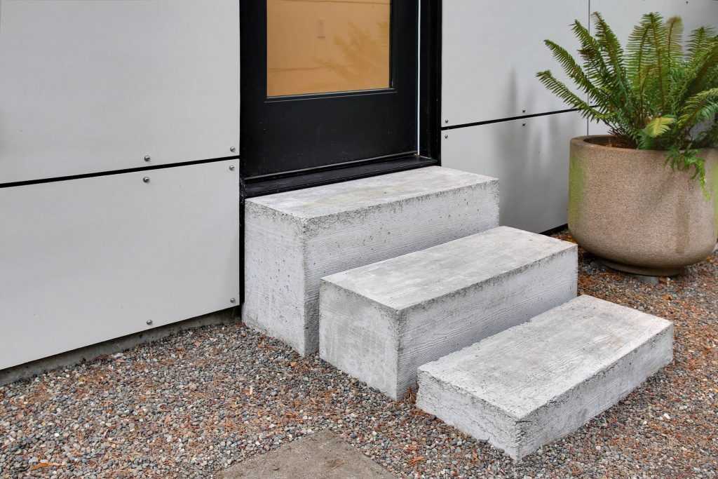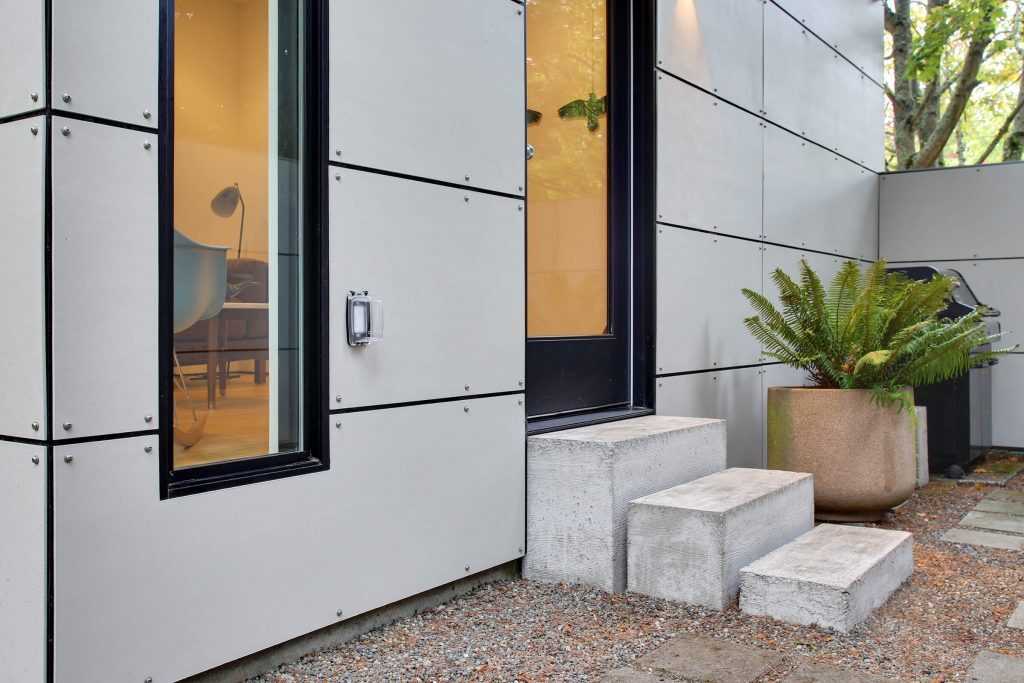 Our client needed a home office that wasn’t inside of the house. The detached garage had an old workshop area that was not being used and was the perfect location for it. It was important to our client to mimic the clean, modern aesthetic of the house. This was achieved by matching the windows and door style with the custom fabricated metal awnings and using the same siding that is on the house. As a creative touch, we fabricated modern, industrial steps with three blocks of poured concrete. Inside, we matched the details of the house that included creating a shadow line at the bottom of the walls to eliminate traditional baseboard as well as not having traditional trim around the windows and door. This home office is much more than just a place to work, our client loves being in the space to simply relax.